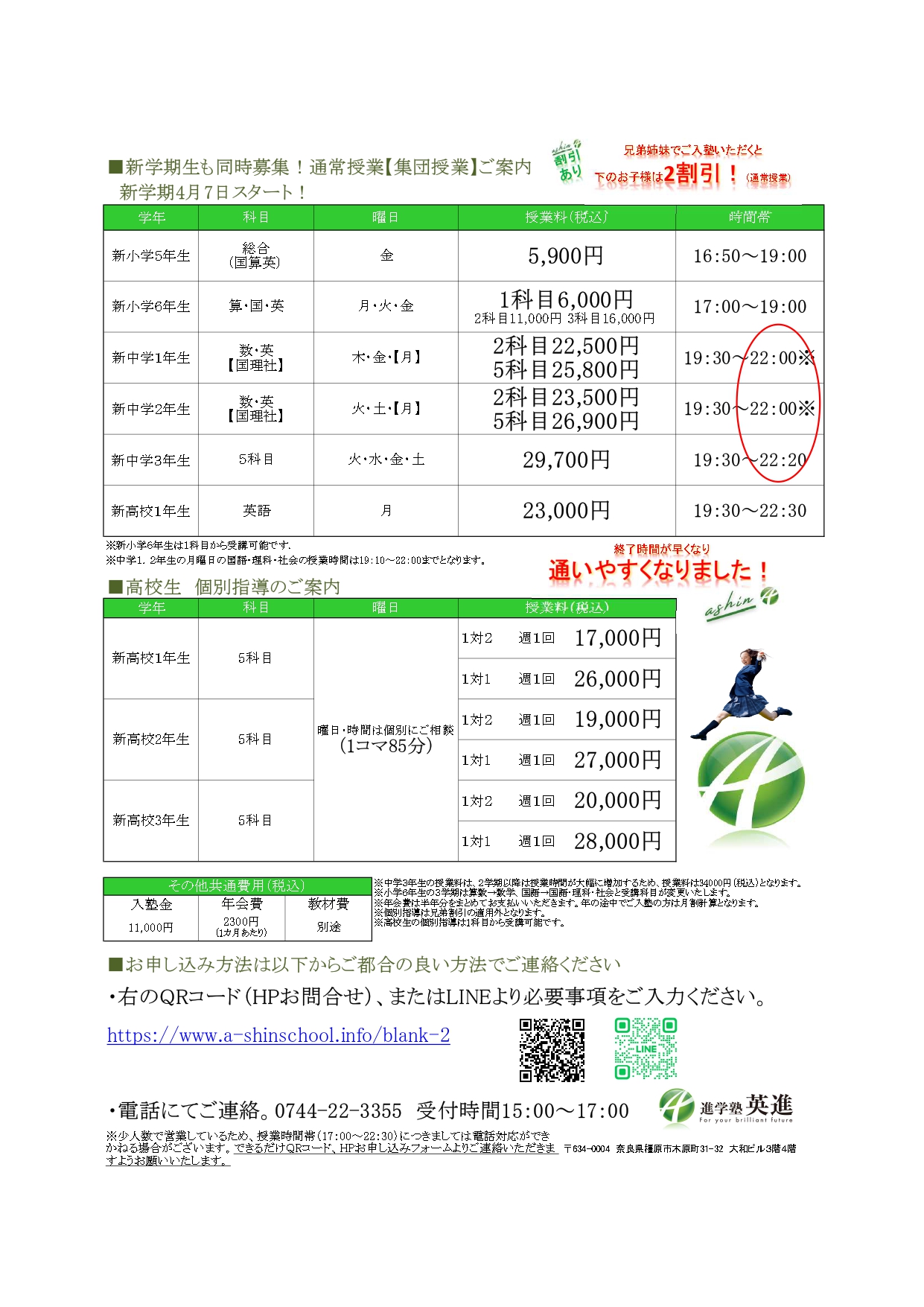通常授業、定期テスト対策、講習会ともに、英進では十分に学習する時間を用意しております。短時間で効率的に学習する、という事を志向するのは当然の事ですが、小中学生の頃というのは時間をかけて体で覚えていく発展段階でもあります。例えば、単語を覚える、方程式の計算を体得する、地名・国名・ことわざ・慣用句を覚える、元素記号を覚える等々、単純に覚えていかなければならないこと、繰り返さないと覚えられない事は山のようにあり、それには時間がかかって当然です。一方で授業時間あたりの授業料は近隣の塾ではかなり安くなっています。(他塾と比較していただければ一目瞭然です。)英進では、時間をじっくりかけて面倒を見る、という姿勢を開塾以来堅持してきました。今後もこのスタンスは変わりません。